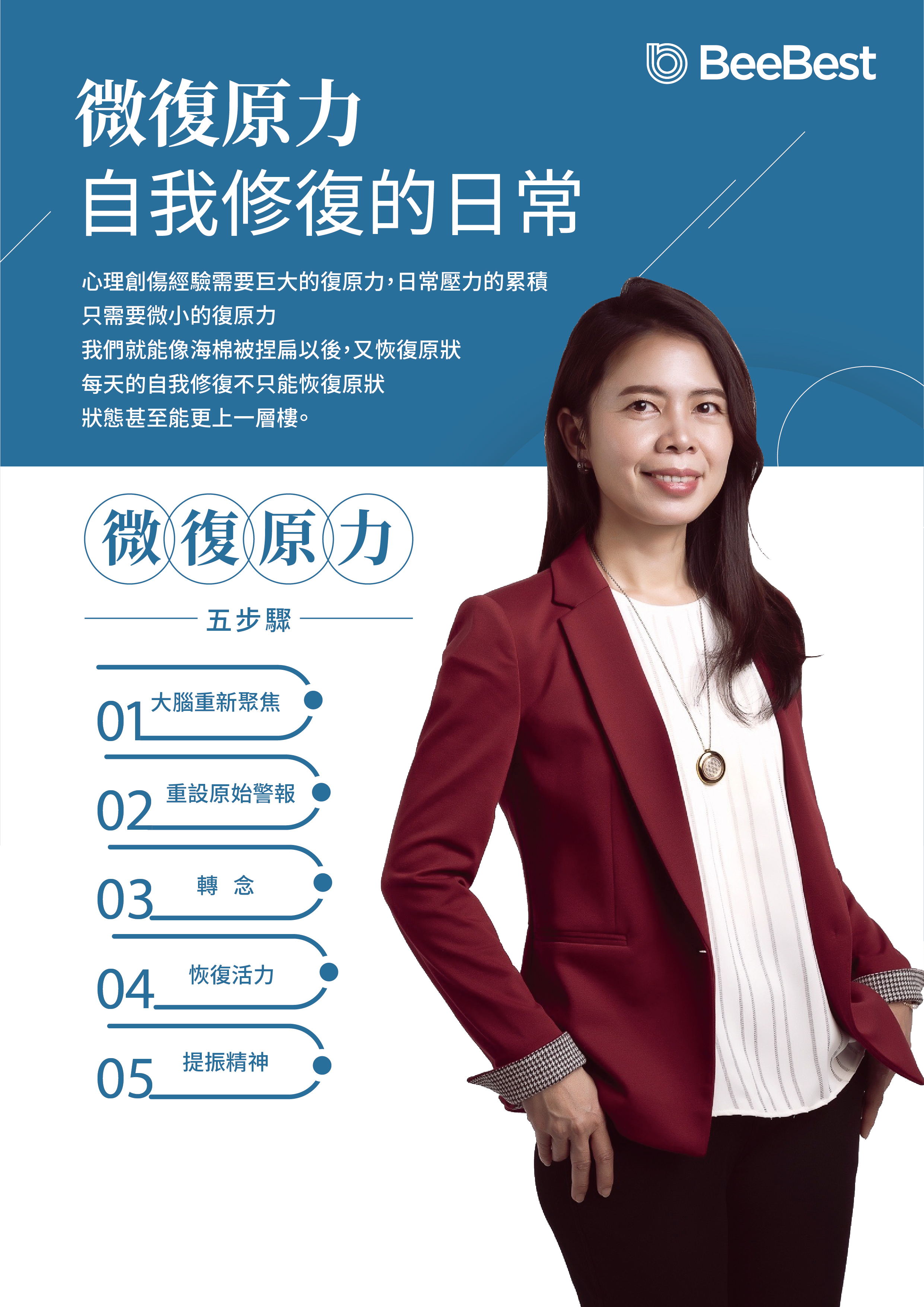 幸福二部曲『紓壓微復原力』,主軸是探討自我的對話與認知,建立起自己的微復原力方式與場景,進而對應到情緒事件的轉念與增強自我工作價值信念,讓自我對於職場與生活滿意狀態達到一個動態的平衡,那麼個人的績效與創新便可以持續發生。